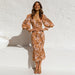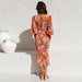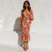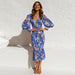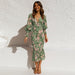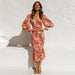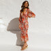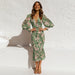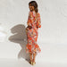 Långärmad elastisk midja volangklänning med v-ringad tryck