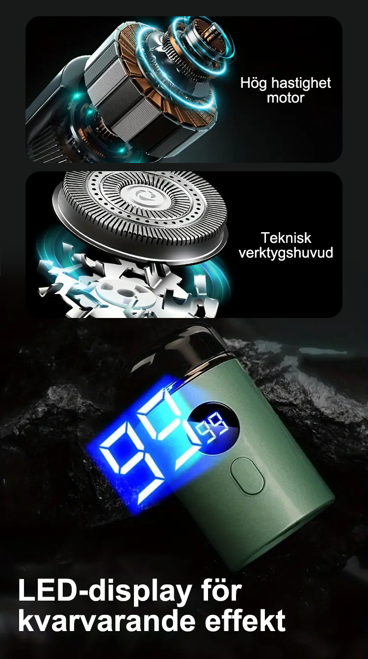 Den här rakapparaten är utrustad med en inbyggd smart digital skärm som övervakar batterinivåerna i realtid, vilket gör att du kan hålla koll på kvarvarande användningstid och undvika oväntade avstängningar.